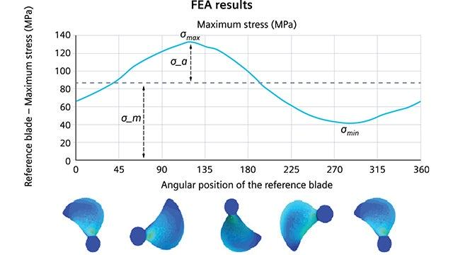 FEA result: The graph shows the dynamic stress during one revolution and the mapped stress distribution on the surface of the reference blade.